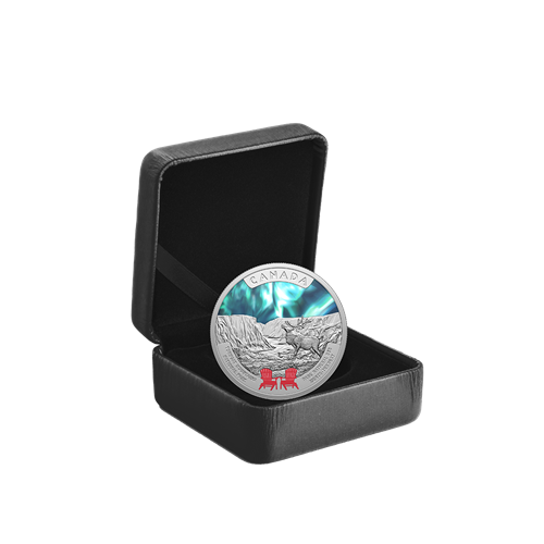 Designed by Nunatsiavut artist Bronson Jacque, your coin’s reverse invites you to take a seat and enjoy the view from Torngat Mountains National Park, located on the northern tip of the Labrador Peninsula. The engraved setting is a U-shaped glacier valley, and the scene depicts a lone caribou lifting its head to the sky as the aurora borealis colourfully lights up the night. Selective colour also highlights two red Adirondack chairs—a familiar sight in Canada’s national parks. The obverse features the effigy of His Majesty King Charles III by Canadian artist Steven Rosati.