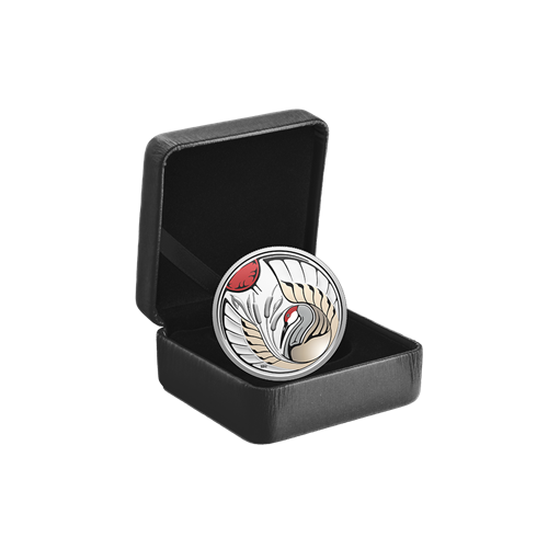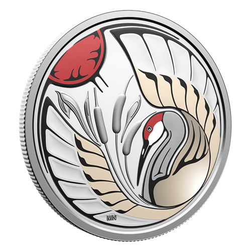 Designed by Anishinaabe artist Mark V. Nadjiwan, the coin’s reverse shows a red sun in the morning sky, with an additional touch of red colour on the top of the Sandhill Crane’s head. Ajijaak (the Crane) stands poised among the cattails, wings unfurled as if ready to lift its call across the land. The obverse features the effigy of His Majesty King Charles III by Canadian artist Steven Rosati.