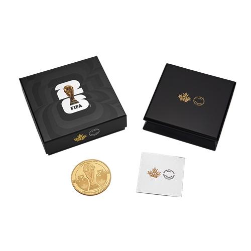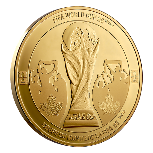 It is the ultimate celebration—the culmination of a journey across stadiums, nations, and hearts alike, as the winning team lifts the FIFA World CupTM/MC Trophy before a packed stadium and a massive global audience. Cheering crowds, each adorned with the FIFA Canada 2026MC/TM maple leaf mosaic emblem, radiate excitement and pride on this impressively sized 5 oz. 99.99% pure gold coin. With the FIFA Wold CupTM/MC Trophy front and centre, the coin’s reverse captures the joy, unity and spectacle of the beautiful game while preserving the spirit of FIFA World Cup 2026TM/MC, allowing fans to relive the triumph and emotion for years to come.