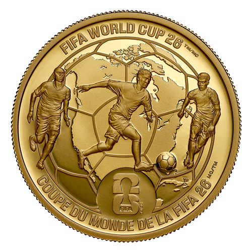 This 1 oz. 99.99% pure gold coin celebrates the three host countries of Canada, Mexico and the United States coming together for the first ever three country FIFA World CupTM/MC. On the coin’s reverse, a map of North America is overlaid with a classic football (soccer ball) pattern, taking on the appearance of a globe and welcoming the world to the tournament, while three players are depicted in dynamic motion, representing the passion that connects fans and players on the pitch, in the stands, and around the world.