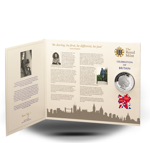 The courage and determination of one of the mostmemorable statesmen from the Second World Waris the focus of this coin, its design inspired by a bronzestatue in London’s Parliament Square. Anita Roddick’sfamous words evoke the spirit of the Games that willtouch the world in 2012.