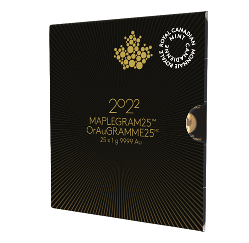 The Royal Canadian Mint is proud to launch the 2022 Maplegram25™, a composite of twenty-five GML coins each weighing 1 gram of 99.99% pure gold, packaged in a divisible blister pack wrapped in an elegant sleeve. Each coin blister has a distinct serial number, and the assay certificate on the sleeve certifies the purity and weight of the coins.