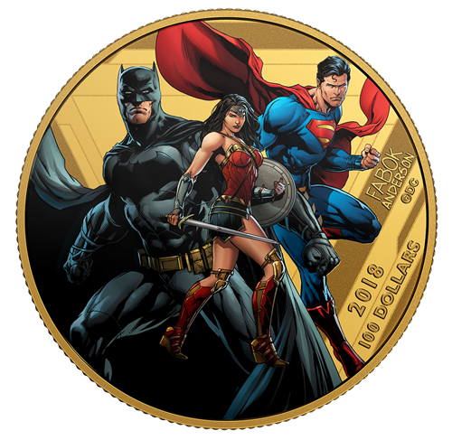 Exclusively designed by Canadian comic book artist Jason Fabok, the original art on your coin brings together three iconic Super Heroes that are at the heart of the Justice League. DC Universe’s powerful Trinity are the very image of strength and resolve: there’s Batman, whose billowing dark cape hints at his preference to work in the shadows; a steadfast Superman who, in contrast to Batman,openly uses his abilities for the good of humanity;and uniting them at the centre, an image of Wonder Woman standing in an action pose that conveys the fearlessness of an Amazonian warrior. Canadian colorist Brad Anderson has re-created all the iconic colours of their costumes, which are heightened by the golden gleam of the engraved contemporary background. The reverse also features the year“2018” and the engraved face value “100 DOLLARS”. The obverse features the effigy of Her Majesty Queen Elizabeth II by Susanna Blunt.