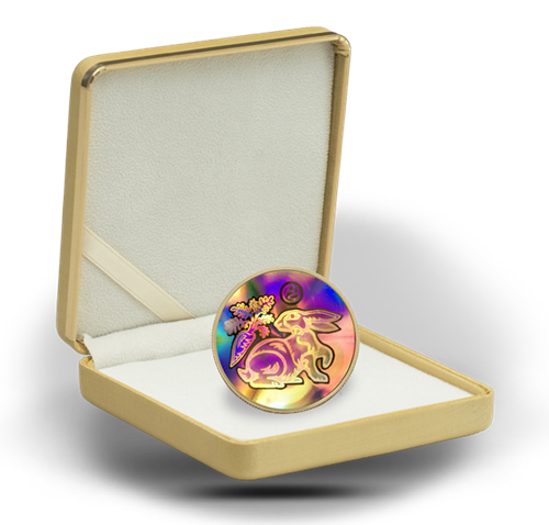 The shimmering colours on this hologram coin areunmatched for their vibrant, changing beauty. Theycreate the perfect canvas to capture the amicablecharacter of the Rabbit.