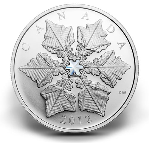 Your coin re-creates a single large snowflake, its six delicate arms engraved in exceptional detail. The heart ofthe snowflake is embedded with a clear snowflake shape Swarovski crystal element. This coin is engravedwith the word “Canada” and the year “2012.”