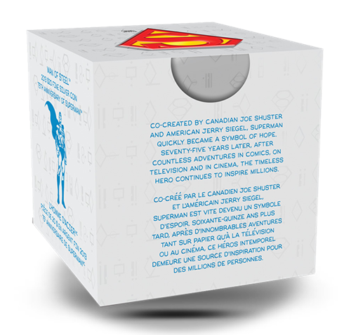 • Features Superman’s native Kryptonian language, as created by DC Comics, and reads “75 Years of Superman”.