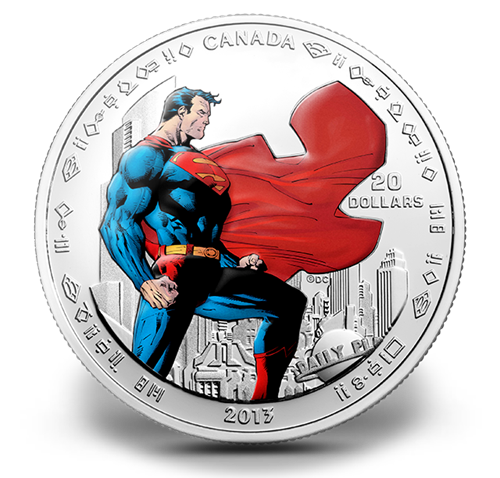 This 20-Dollar coin is certified to be 99.99% pure silver with a diameter of 38 millimetres and a metal weight of 31.39 grams. The reverse image, provided by DC Comics/Warner Brothers, features Superman standing guard over the city of Metropolis. The reverse is engraved with the word “CANADA,” the date “2013,” and the face value of “20 DOLLARS,” as well as “75YEARS OF SUPERMAN.” The obverse features the effigy of Her Majesty Queen Elizabeth II by Susanna Blunt.