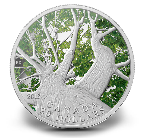 The tree fills the entire reverse, also engraved with the word “CANADA,” the date “2013” and the face value of “20 DOLLARS.”