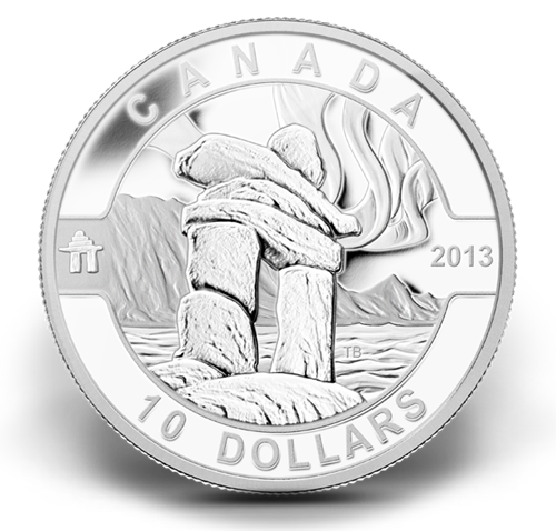 Your coin was designed by Canadian artist Tony Bianco and features a human-shaped Inukshukstanding before the icy mountains, frozen sea and aurora borealis characteristic of the Canadian Arctic.
