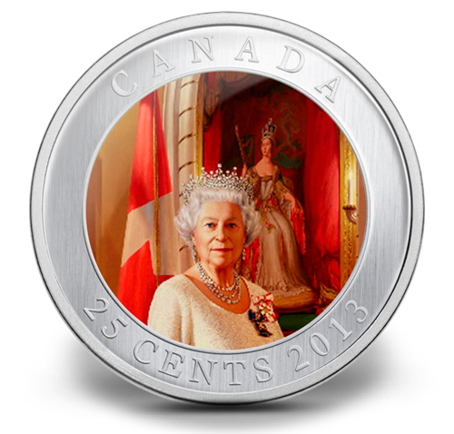 This coloured cupronickel coin captures thespirit of Canadian artist Phil Richards’ 2012 official portrait of Her Majesty Queen Elizabeth II, in celebration of Her Majesty’s Diamond Jubilee. The reverse also features the engraved word “CANADA,” the date “2013” and the face value of “25 CENTS.”