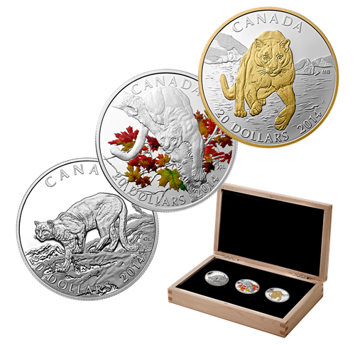 The cougar is one of Canada's most powerful, elusive andbeautiful predators. This silent hunter is the perfect subject for the Royal Canadian Mint's stunning new three-coin and five-coin sets. Viewed together, the series showcases the variety of finishes, selective plating applications, colour and preciousmetals used by Royal Canadian Mint engravers to bring life and energy to every image.