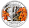 The reverse image by Canadian artist Tony Bianco features a striking autumn scene in a Canadian forest. In the foreground, clusters of golden-orange sugar maple leaves frame the right and left sides of the composition. In the background, a fast-rushing tiered waterfall—engraved directly into the silver—cascades down a sloping grey rock face carpeted in greenmoss and fallen maple leaves. The waterfall leads to an engraved silver brook rushing over a rock-strewn riverbed. At the top of the rock face, the tall tree trunks of a deciduous forest are lent mystical beauty through engraving that evokes the sun’s rays falling through a forest still densely canopied in early autumn. The design uses a combination of colour, the silver coin surface and engravingto create a homogenous and painterly image.