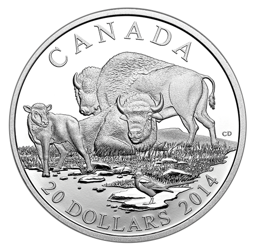 Designed by Canadian artist Claudio D'Angelo yourcoin depicts a family grouping of three plains bison. The bull's side profile is seen as it standsin the background, an imposing figure amidst the grassy landscape on this early summer day. Next to it,a cow rests on its forelegs but keeps an ever-watchful eye on the calf. This young bison is inquisitively studying a black-billed magpie (seen in the foreground) as the black and white bird forages for insects along the dusty ground. Above this serene scene, the word "CANADA" is engraved, while the face value of "20 DOLLARS" and the date "2014" are engraved below the bison and magpie. The coin also features edge lettering with the words "1 OZ FINE SILVER 1 OZ ARGENT PUR" engraved in a repeatingpattern around the coin's edge.