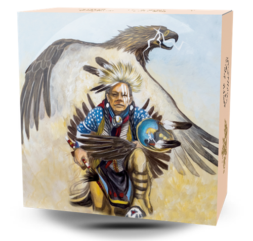 Designed by Canadian artist Cyril Assiniboine, who is Ojibwa, your coin presents his interpretation of a key scene from the Legend of Nanaboozhoo. After climbing the highest cliff to reach the Thunderbirds’ nest, Nanaboozhoo has incurred the horrible wrath of these majestic birds by plucking feathers from their young to strengthen his arrow. The imposing figure of one Thunderbird looms large in the background as it closes in on Nanaboozhoo, with lightning crackling from itseyes and thunder rolling from its beak. A full-faceview of Nanaboozhoo allows for his traditional Western Ojibwa dress to be seen in greater detail.