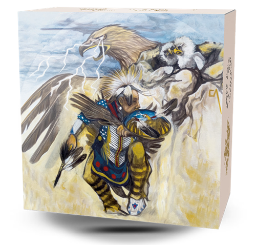 Designed by Canadian artist Cyril Assiniboine, who is Ojibwa, your coin depicts Nanaboozhoo climbing the highest cliff to get to the Thunderbirds’ nest, where he has plucked feathers from the youngbirds (seen in the upper right side of the image). But the fully grown Thunderbirds have since returnedto the nest and are angered by Nanaboozhoo’s actions. With lightning flashing from a Thunderbird’s eye and thunder rolling from its beak, Nanaboozhoo quickly flees from the Thunderbird’s wrath while clutching the feather-adorned arrow in his right hand.