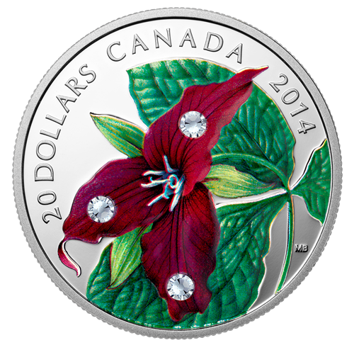 This coin features a bright burgundy red trillium bloom where three ruddy petals sit atop three red-lined green sepals. From the centre of the flower rise six pink stamens and three short stigmas. Viewed from the front and slightly above, the flower is perched on a bowing, delicate green stem above the characteristic whorl of three leaf-like bracts borne by all trilliums. Each petal of the flower is adorned with a sparkling crystal-coloured Swarovski element.