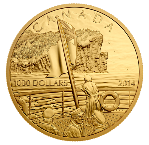 This coin captures a poignant moment as a departing soldier takes one last look at the Canadian coastline. It is October 1914 and the SS Megantic is among the ships transporting the first Canadian troops to British soil in theearly days of the First World War. One soldier is leaning against the stern’s guard rail, his back momentarily turned on his shipmates who have gathered onthe deck. With the Canadian Red Ensign softly flapping in the breeze overhead, the soldier takes a longlook at the soaring cliffs of the Gaspe Peninsula as the ship brings him closer to the battles that surely lie ahead. Sadly, this sight would prove to be the last glimpse of Canada for many of its brave soldiers, whose personal sacrifices during the war woulddo much to shape the nation.