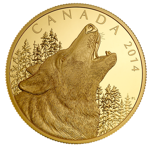 Your coin was designed by Canadian artist Pierre Leduc and presentsa profile portrait of a howling wolf backed by a coniferous forest. The central feature of the image isthe highly detailed right-side profile of the head of a wolf, its muzzle turned skyward and its mouth open in the wolf's familiar howling pose. Using up to four separate finishes to emphasize the texture of the wolf's coat across its face, muzzle, ears, and neck, and to bring a lifelike gleam to its haunting eye, Royal Canadian Mint engravers have lent additional beauty to the artistry of the original design. These finishes also help to deepen the senseof high relief for the fore grounded wolf, which seems ready to emerge from the background of coniferous trees against which it is set.