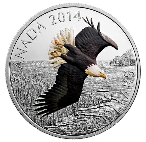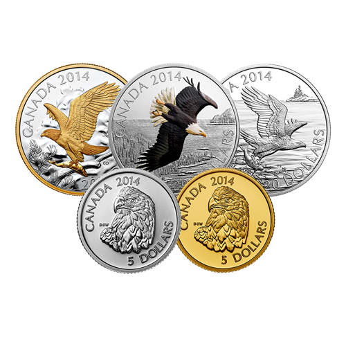 • These premium coins are part of the Royal Canadian Mint’s 2014 five-coin series of fine silver, gold, andplatinum coins featuring four “day in the life” scenes of the iconic Bald Eagle.