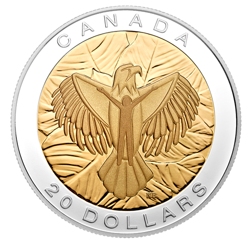 Your coin was designed by Canadian artist Nathalie Bertin, who is Metis, and depicts a powerful image of an eagle soaring in flight while an abstract figure reaches out to embrace the eagle and its teachings of love. The eagle’s wings and tail feathers form thesubtle shape of a heart while a background pattern of tobacco leaves reinforces the eagle’s teachings.