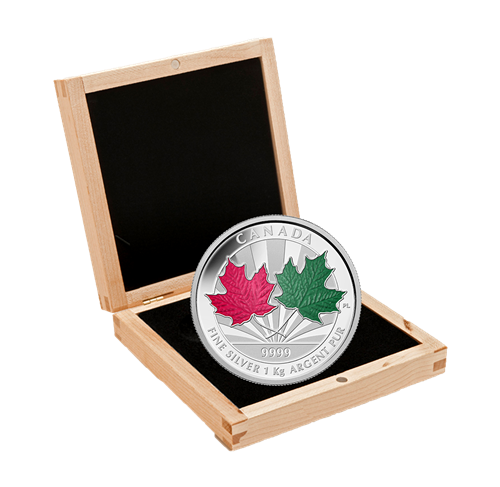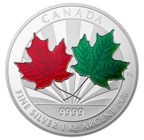 Your coin is a beautiful design of two maple leaves selectively enamelled in red and green to reflect the ever-changing beauty of Canada's national symbol through the seasons with rays of sunshine in the background accented with matte and brilliant finishes.