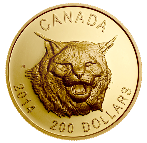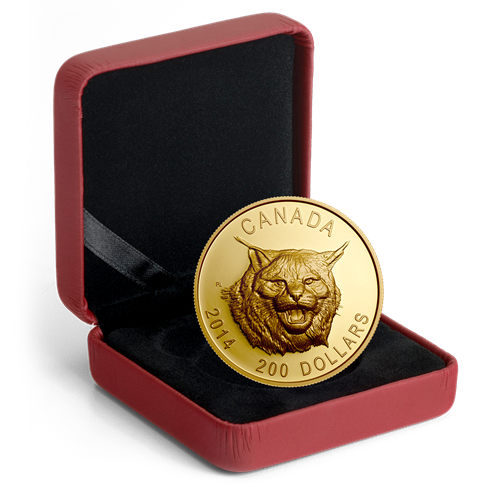 Native to the boreal forests that stretch from Yukon to Newfoundland, the Canada lynx (Lynx canadensis) is one of the most common wild cats in Canada. Yet, encounters with this stealthy, agile predator remain rare; this pure gold coin captures the beauty of Canada's elusive feline in a forceful show of strength.