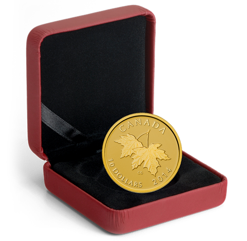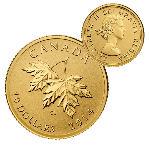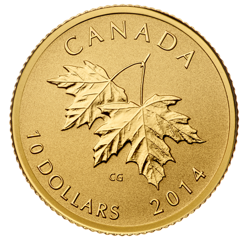 Pointing downward, the two overlapping maple sugar leaves are attached by their stems to a single twig at the top of the image. The leaves are engraved with careful precision using a variety of textures to lend depth to the image. The reverse is engraved with the words “CANADA”, the date“2014”, and the face value of “10 DOLLARS”. The obverse design features the first obverse of Her Majesty Queen Elizabeth II to appear on Canadian coinage in 1953, when she was 27 years old. Her Majesty wears a simple laurel wreath around her head. Her shoulders are draped in a flowing garment. The effigy is encircled with the Latin legend “ELIZABETH II DEI GRATIA REGINA,” which means “Elizabeth II, by the grace of God, Queen.”