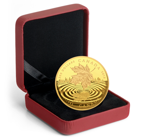 Designed by Canadian artist Lilyane Coulombe, your coin features a natural scene with timeless appeal: here,a single maple leaf has fluttered down from a branch above onto the still waters below it. Canada's beloved symbol is showcased in stunning detail thanks to finely detailed engraving that recreates the veins which run along its lobes. Gently piercingthe water's mirror-like surface, the tip of the leaf's lobe has set off a wave of soft ripples; and yet the leaf's micro-engraved reflection remains, bouncing with the water's movement in a serene moment that would be all too brief—had it not been forever suspended in time withthis coin.