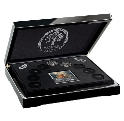 This nine-coin series featuring the most famous figures of Norse mythology has been brought to life in amagnificent Antique finish with a high-relief strike.
