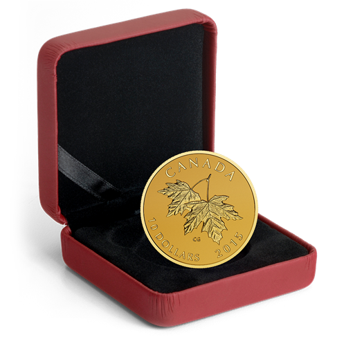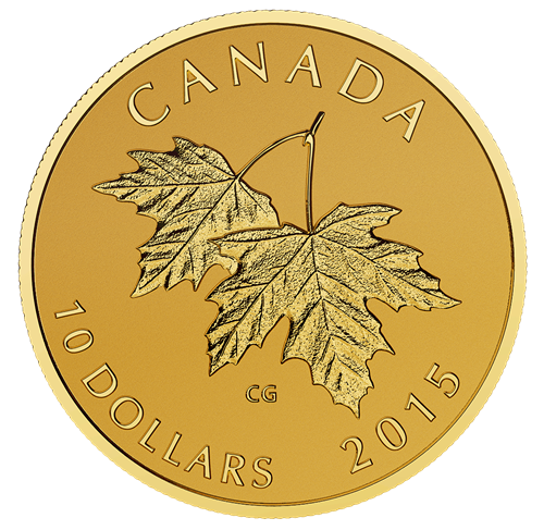 Designed by Canadian artist Celia Godkin, your coin features two sugar maple leaves. Pointing downward, the overlapping leaves are attached by their stems to a single twig at the top of the image. The leaves are engraved with careful precision using a variety of textures to lend depth to the image. The reverse is engraved with the words "CANADA" the date "2015" and the face value of