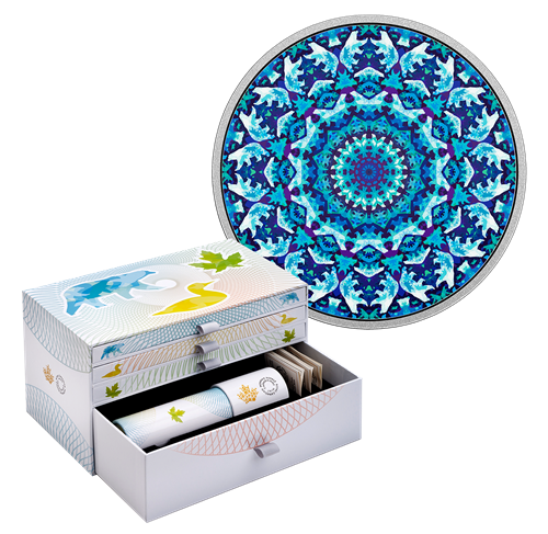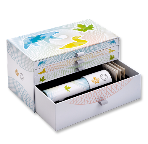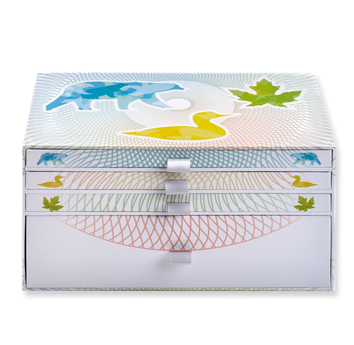 Your coins are encapsulated and presented in a Royal Canadian Mint-branded box that stores each of your three coins in separate drawers and includes space for your kaleidoscope and coin certificates.