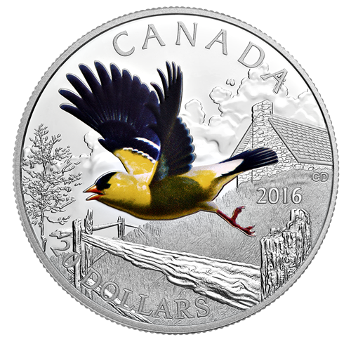 Designed by Canadian artist Claudio D'Angelo, your coin features a highly detailed engraved portrait of a maleAmerican goldfinch taking flight in rural Canada. In the engraved background, an ancestral farmhouse rises up from behind a hillock on the right, while aroughly textured split-rail fence stands between the old stone building and the aspen tree on the left. Beneath the partially cloudy sky, the handsome American goldfinch lifts off from its perch on the fence post. The application of rich colour over engraving captures the exquisiteness of its brightly coloured plumage—particularly the striking contrast between its cheerful yellow feathers with white markings and the black of its forehead, outstretched wings and tail.