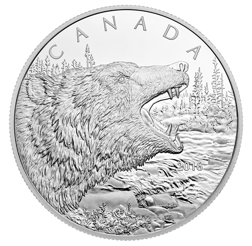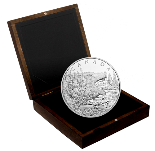 The grizzly bear is one of nature's most imposing sights—even more so when it roars. This exceptionally detailed, low-mintage coin captures all the power of that fearsome stance in fine silver, set against a background depicting the vast remoteness of the Canadian wilderness.