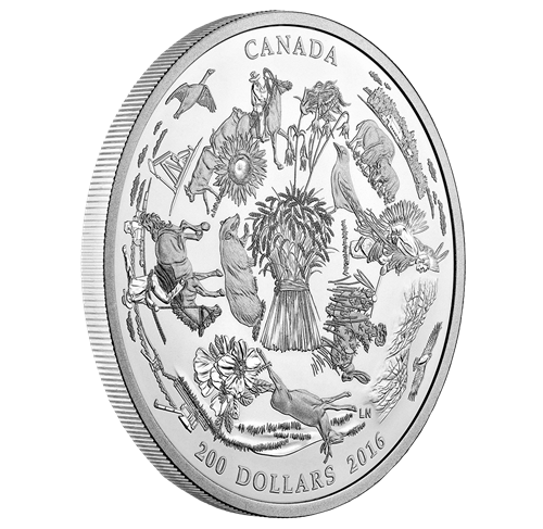 This magnificent coin celebrates the beauty of our western interior, where flora and fauna are as diverseas the people who inhabit it. The intricate detailof the masterfully engraved design evokes Canada’s beauty and diversity, as told through powerful symbolism associated with each ecozone.