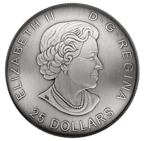 The reverse boasts an astonishing level of dimension and depth through the use of the coin's concave shape, which lends itself beautifully to recreating the Library of Parliament's lavish interior and domed ceiling. A unique viewing perspective from the base of themarble statue of Queen Victoria immerses the viewerin the artwork, conveying the reading room's soaring height and spaciousness while creating the impression that they are on-site, looking upward at the ceiling. The intricately carved pine bookshelves that encircle the reading room are replicated on the reverse along the rim, further contributing to the 360-degree viewing experience. Finally, the application of a timeless antique finish to the ultra high relief engraving showcases the meticulous precision and masterful artistry that makes this coin a numismatic masterpiece. Beneath the statue, a banner features the engraved commemorative dates "1876-2016".