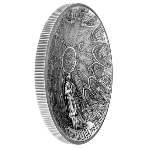 The Library of Parliament is one of Canada's greatest architectural treasures. It's the only remaining section of the original Centre Block that was destroyed by fire in 1916, and continues to hold visitors spellbound as they gaze up at its massive domed ceiling and elaborate woodwork. Now, this gem can be enjoyed simply by taking in the stunning 360° view served up by this unique concave shaped coin. It creates an astonishing sense of depth and dimension that is further enhanced by ultra high relief and an antique finish that gives each coin a one-of-a-kind historic appeal.
