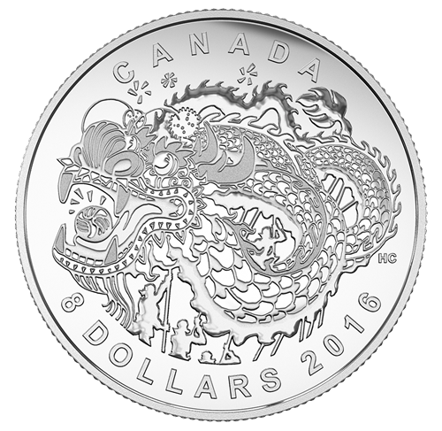 Designed by Canadian artist Harvey Chan, your coin features a traditional Chinese dragon, its long, serpentine body disappearing far into the distance. The dragon's undulating form conveys the dynamic energy of its danceas numerous people with poles move its body above their heads. Above the dragon, tiny bursts add a festive tone to the image. The dragon's face is reminiscent of a horse, but it also has a beard, whiskers, fangs, horns, fish scales and is holding the “pearl of wisdom” is its mouth.