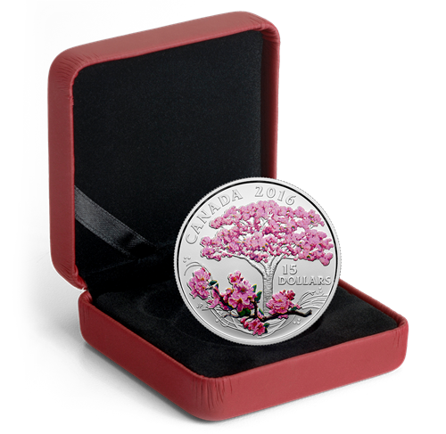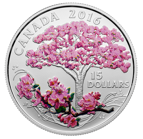 Designed by Canadian artist Jan Poynter, your coin captures the soul-stirring splendour of a blooming Kwanzan cherrytree, as can be seen in many parks and neighbourhoods throughout Canada in the spring. Finely detailed engraving recreates the delicate appearance of theiconic five-petal blossoms, both on the tree and the flower-laden bough in the foreground.