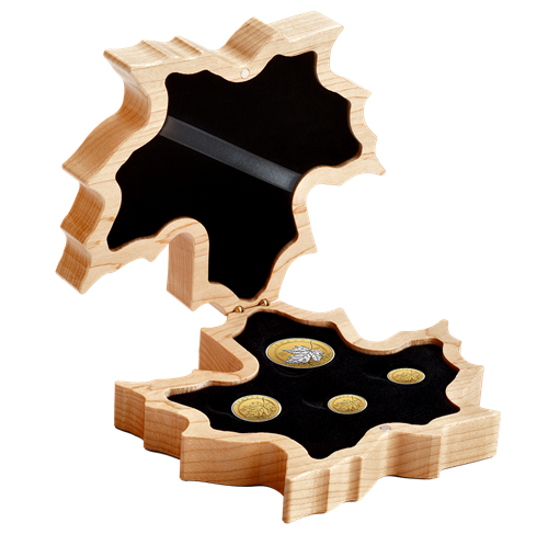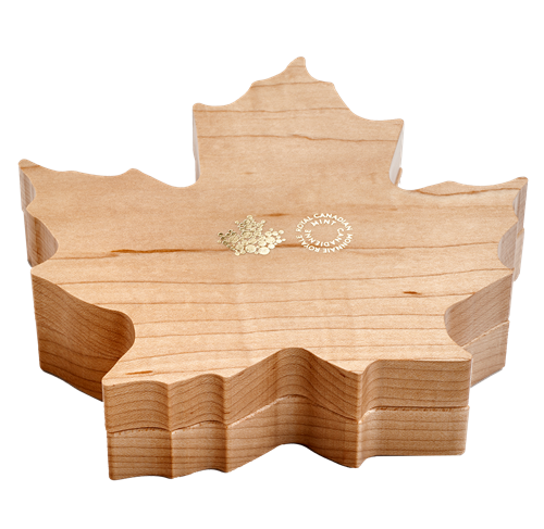 Your coins are encapsulated and presented in a Royal Canadian Mint-branded custom leaf-shaped maple wood case.