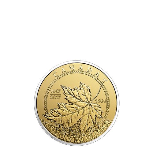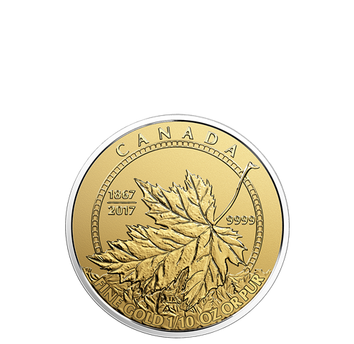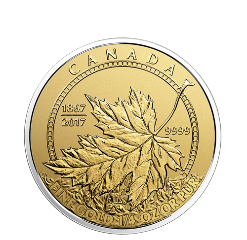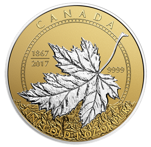 All four coins feature a design by Canadian artist Lisa Thomson-Khan that celebrates Canada's 150th anniversary through a natural portrait of a Canadian icon. Asingle engraved leaf from a red maple tree (Acer rubrum) gently falls upon a bed of leaves against the reverse proof background. Theleaf is lovingly brought to life in impeccable detail, with meticulously engraved veins that run through each lobe towards the leaf's serrated edge.The first-time application of platinum plating creates a pleasing contrast against the gold background, while adding an unexpected shine to the magnificent leaf on the 1 oz. coin and to the rim of each coin. The reverse on all four coins also include the engraved word “CANADA”, the commemorative dates “1867-2017” and the purity, which has been struck incuse.