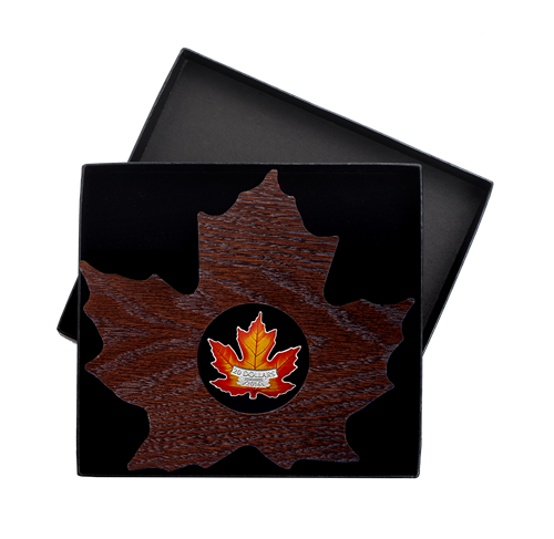 Your coin is presented in a special maple leaf shaped dark stained wooden case complete with a viewing window in the lid, allowing for this symbol of Canadian prideto be displayed and viewed at any time.