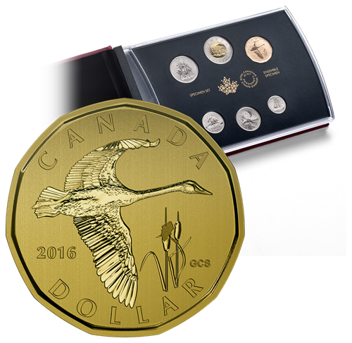 The one-dollar coin in the 2016 specimen set of Canadian coinsfeatures a reverse image by Canadian artist Glen Scrimshaw. Beautifully depicted in its natural setting, the tundra swan is particularly resplendent with features that are brought to life through finely detailed engraving and the unique combination of finishes. As with all Canadian "loonies,"this coin features an 11-sided shape and raised edging.