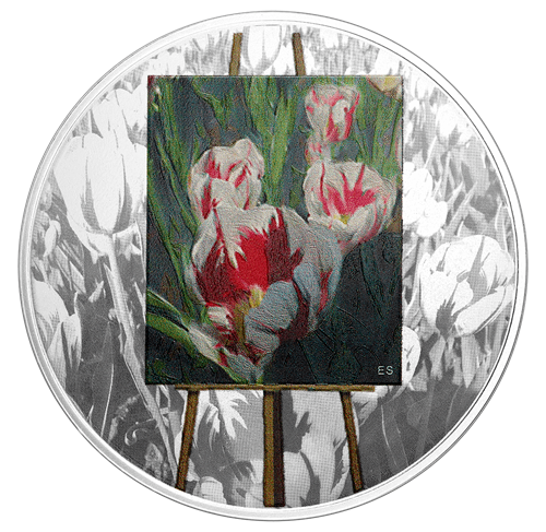 Designed by Canadian artist Elizabeth Sim, the first coin in your subscription creates an immersive viewing experience by blurring the line between reality and perception. Stretching across the entire reverse, the borderless background image offers aphoto-realistic close-up of a flowerbed—specifically one that showcases several Canada 150 tulips in full bloom. In contrast, the easel-mounted canvas in the foreground is positioned in a way that suggests the viewer is in fact the artist, as the eye naturally lingers on the finished painting of the white and red-flamed tulip.This simulation of a plein air painting experience is further enhanced by the integration of two advanced technologies: texturized colour, which gives the design its sense of depth anddimension by subtly raising the easel and canvas; and canvas effect, which artfully adds a touch of realism by mimicking the surface textures of a finished painting—including the artist's brushstrokes.