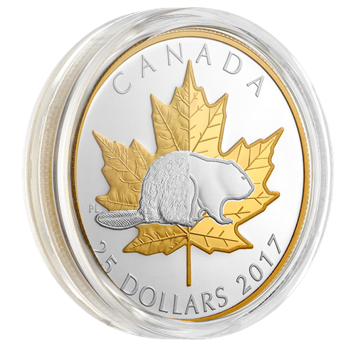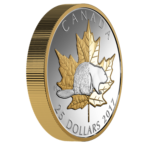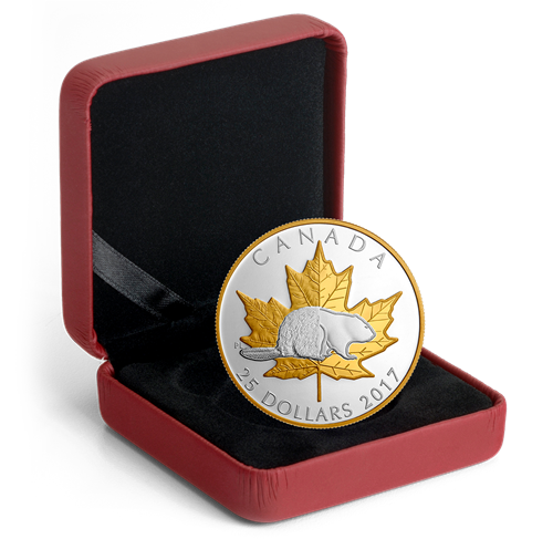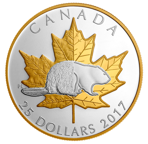 Designed by Canadian artist Pierre Leduc, your coin carries great meaning on this 150th anniversary of Confederation, by paying tribute to Canada's evolving history through the two foremost national icons. A transition marks the centre of the field, with classic depictions on the left to represent the nation's past (1867), and more contemporary versions on the right to represent both the present (2017) and beyond. Both icons are resplendent in selective gold plating. Foremost is the beaver, the industrious mammal that is symbolizes Canada's sovereignty. Its tail and back half are texturally detailed, as it has appeared on previous coin designs, while the front portion transitions into a stylized silhouette that offers a more modern take on this Canadian icon. Behind it is the iconic maple leaf, whose serrated edges and deeply veined lobes are fixtures throughout the design. The left features a more natural and life-like appearance that evokes the reverse of the beloved Silver Maple Leaf (SML) coin, while the right portion places a strong emphasis on symmetry and conveys a sense of strength.