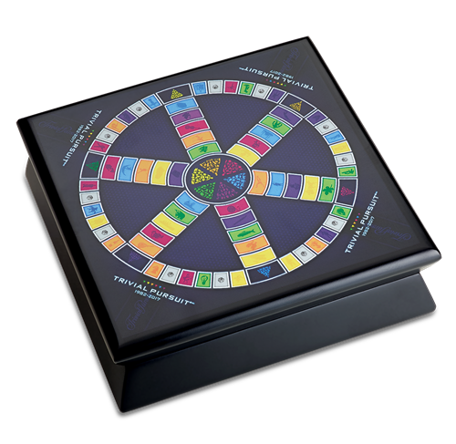 Your coin comes beautifully enclosed in a premium wooden case and custom packaging that cleverly mimics aTrivial Pursuit game board and box.