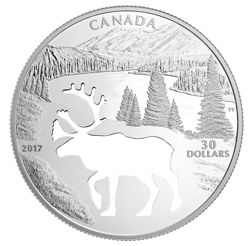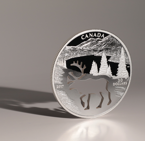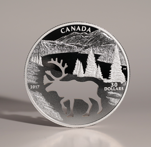 Designed by Canadian artist Trevor Tennant, your coin transports you to the mountainous landscape of Western Canada, where detailed engraving and multiple finishes recreate a timeless snapshot of the wild. The distant peaks provide a breathtaking backdrop tothe grassy foothills, which slope down to the tree-lined river below; and while the beauty of the engraved scene is unmistakable, it is the uniquely shaped cutout that easily draws the viewer's eye. Innovative technology has skillfully carved out theoutline of a woodland caribou, smoothly recreating its distinctive profile and towering rack of antlers. The missing caribou element is strongly symbolic: while it represents an artistic tribute to a beloved species, the overall design also offers a haunting re-imagining of the Canadian wilderness without this national icon—particularly the Southern Mountain population of caribou, which is listed as threatenedon Canada's Species at Risk Act (SARA).