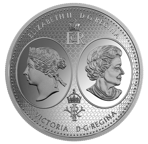 - PAST MEETS PRESENT! The double-effigy obverse bridges Canada's past (1867) and present (2017) by commemorating Her Majesty Queen Elizabeth II, our current sovereign, and Her Majesty Queen Victoria, the sovereign at the time of Confederation. It also features their royalcyphers, each one ensigned with a crown depicted in a distinctive style.