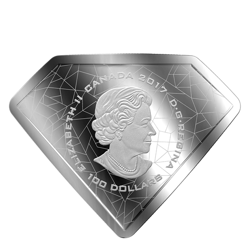 The reverse design of this "diamond"-shaped coin features an engraved rendition of Superman's shield. Within the "S" of the shield, scenes from several Superman comic books are positioned as a unique collage that highlights Superman's long and illustrious history; this visual journey through Superman's different looks and eras is carefully covered by transparent enamel, which allows the engraving to peer through the red sheen of the "S".A laser halftone pattern behind the shield adds a graphic element that fills the background and infuses design with a classic comic book feel. The obverse features the effigy of Her Majesty Queen Elizabeth II by Susanna Blunt and the words "CANADA", "2017" and "100 DOLLARS".