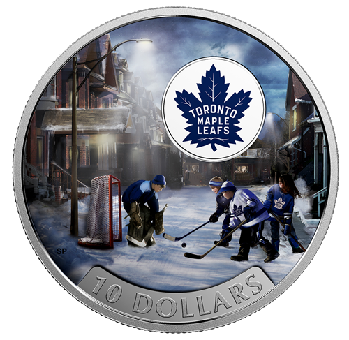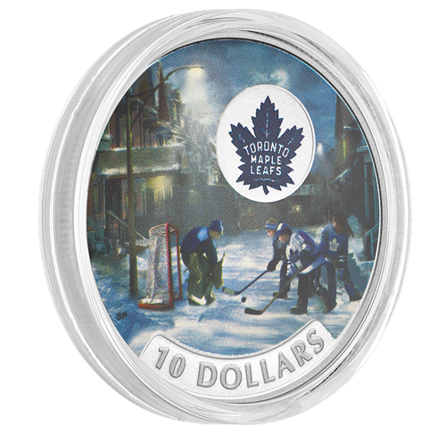 Designed by Canadian artist Silvia Pecota, your coin features full colour over an engraved scene that pays tribute to the hockey legacy of the Toronto Maple Leafs®.On this quiet residential street, a fast-paced game of street hockey has outlasted daylight; under theglare of the street light overhead, four young Leafs fans are dressed in their warmest winter gear, which match their favourite team's colours. Winter's chill hasn't slowed them down—each breath is visible in the cold air as two players rush to the net. With each player racing to steal away the puck, one closes in on it to try to poke it past the fourth youth guarding the net. There's a timeless quality to this scene that couldhave easily taken place years ago, were it not forthe brief glimpse of recent models of cars parked in the background. Above these passionate young players is the Toronto Maple Leafs iconic logo in the team's blue and white colours. The reverse also features the engraved face value “10 DOLLARS”. The obverse features the effigy of Her Majesty Queen Elizabeth II by Susanna Blunt.
