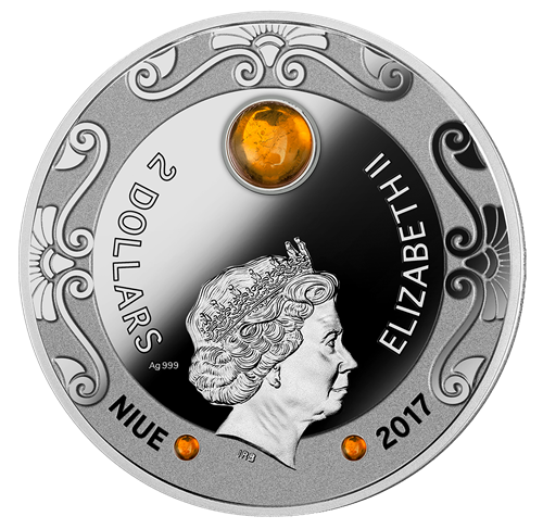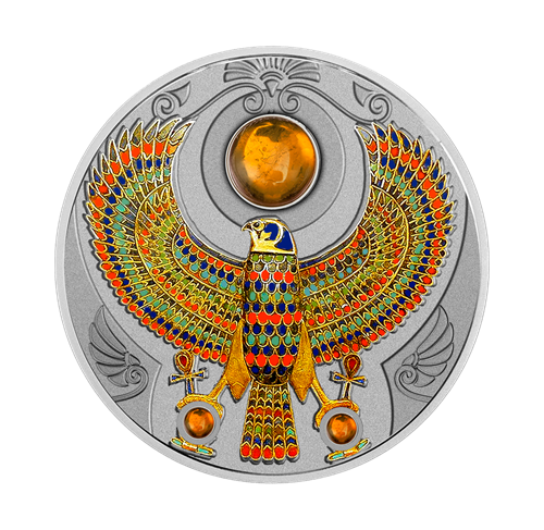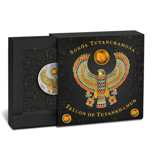 Your coin depicts the Falcon of Tutankhamun, Egyptian style completely coloured, with wings and legs outstretched. Additionally, your coin features three natural amber inserts, two small ones near the legs of theFalcon and a big one between the wings, just above the head. All around your coin are three characteristic Egyptian decorations. The obverse of the coin depicts the effigy of Her Majesty Queen Elizabeth II and the inscriptions: “ELIZABETH II” – the name of the Queen, “NIUE” – the issue country, “2017” – the issue date and “TWO DOLLARS” – the face value. All around the obverse, three characteristic Egyptian decorations and the three natural amber inserts are also visible on the obverse.